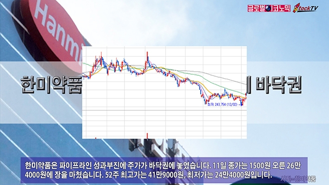 한미약품은 파이프라인 성과부진에 주가가 바닥권에 놓였습니다. 11일 종가는 1500원 오른 26만4000원에 장을 마쳤습니다. 52주 최고가는 41만9000원, 최저가는 24만4000원입니다.