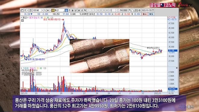 풍산은 구리 가격 상승 재료에도 주가가 하락했습니다. 20일 종가는 100원 내린 3만3100원에 거래를 마쳤습니다. 풍산의 52주 최고가는 4만9950원, 최저가는 2만8150원입니다.