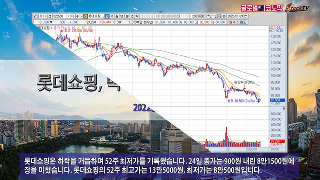 롯데쇼핑은 하락을 거듭하며 52주 최저가를 기록했습니다. 24일 종가는 900원 내린 8만1500원에 장을 마쳤습니다. 롯데쇼핑의 52주 최고가는 13만5000원, 최저가는 8만500원입니다.