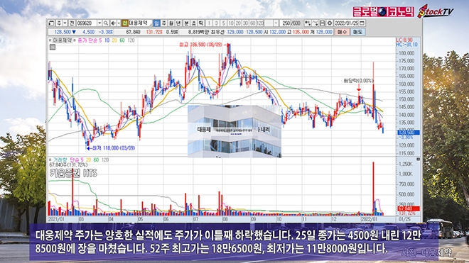 대웅제약 주가는 양호한 실적에도 주가가 이틀째 하락했습니다. 25일 종가는 4500원 내린 12만8500원에 장을 마쳤습니다. 52주 최고가는 18만6500원, 최저가는 11만8000원입니다.