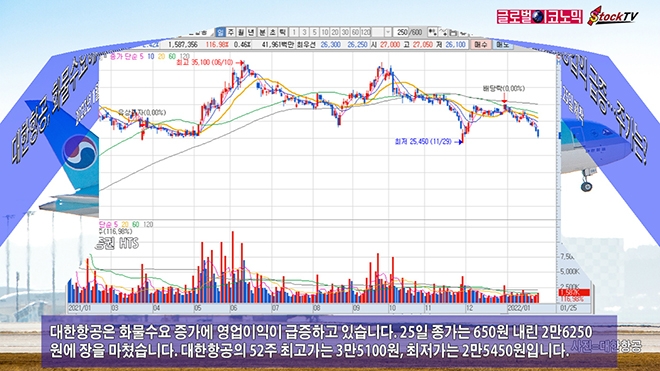 대한항공은 화물수요 증가에 영업이익이 급증하고 있습니다. 25일 종가는 650원 내린 2만6250원에 장을 마쳤습니다. 대한항공의 52주 최고가는 3만5100원, 최저가는 2만5450원입니다.