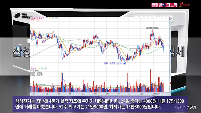 삼성전기는 지난해 4분기 실적 저조에 주가가 내림세입니다. 27일 종가는 4000원 내린 17만1500원에 거래를 마쳤습니다. 52주 최고가는 21만9000원, 최저가는 15만3000원입니다.