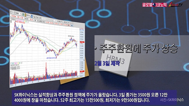 SK하이닉스는 실적향상과 주주환원 정책에 주가가 올랐습니다. 3일 종가는 3500원 오른 12만4000원에 장을 마쳤습니다. 52주 최고가는 15만500원, 최저가는 9만500원입니다.