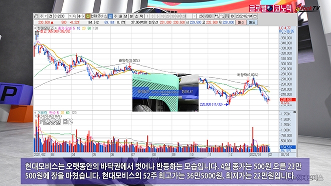 현대모비스는 오랫동안의 바닥권에서 벗어나 반등하는 모습입니다. 4일 종가는 500원 오른 23만500원에 장을 마쳤습니다. 현대모비스의 52주 최고가는 36만5000원, 최저가는 22만원입니다.