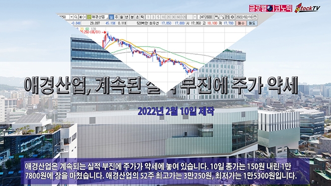 애경산업은 계속되는 실적 부진에 주가가 약세에 놓여 있습니다. 10일 종가는 150원 내린 1만7800원에 장을 마쳤습니다. 애경산업의 52주 최고가는 3만250원, 최저가는 1만5300원입니다.