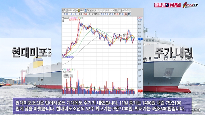 현대미포조선은 턴어라운드 기대에도 주가가 내렸습니다. 11일 종가는 1400원 내린 7만2100원에 장을 마쳤습니다. 현대미포조선의 52주 최고가는 9만7100원, 최저가는 4만8600원입니다.