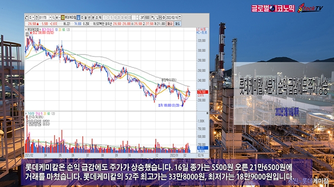 롯데케미칼은 순익 급감에도 주가가 상승했습니다. 16일 종가는 5500원 오른 21만6500원에 거래를 마쳤습니다. 롯데케미칼의 52주 최고가는 33만8000원, 최저가는 18만9000원입니다.