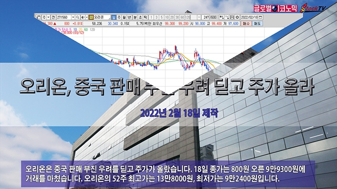 오리온은 중국 판매 부진 우려를 딛고 주가가 올랐습니다. 18일 종가는 800원 오른 9만9300원에 거래를 마쳤습니다. 오리온의 52주 최고가는 13만8000원, 최저가는 9만2400원입니다.
