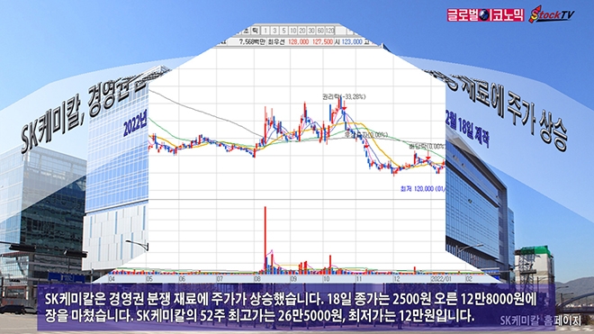 SK케미칼은 경영권 분쟁 재료에 주가가 상승했습니다. 18일 종가는 2500원 오른 12만8000원에 장을 마쳤습니다. SK케미칼의 52주 최고가는 26만5000원, 최저가는 12만원입니다.