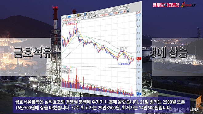 금호석유화학은 실적호조와 경영권 분쟁에 주가가 나흘째 올랐습니다. 21일 종가는 2500원 오른 16만500원에 장을 마쳤습니다. 52주 최고가는 29만8500원, 최저가는 14만500원입니다.