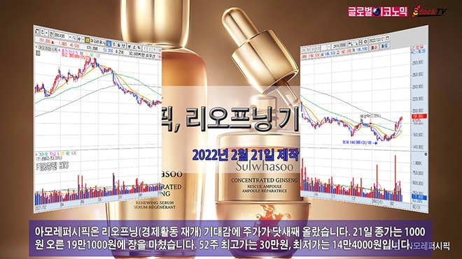 아모레퍼시픽은 리오프닝(경제활동 재개) 기대감에 주가가 닷새째 올랐습니다. 21일 종가는 1000원 오른 19만1000원에 장을 마쳤습니다. 52주 최고가는 30만원, 최저가는 14만4000원입니다.