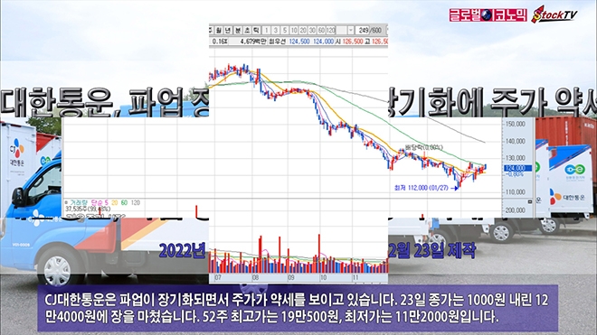 CJ대한통운은 파업이 장기화되면서 주가가 약세를 보이고 있습니다. 23일 종가는 1000원 내린 12만4000원에 장을 마쳤습니다. 52주 최고가는 19만500원, 최저가는 11만2000원입니다.