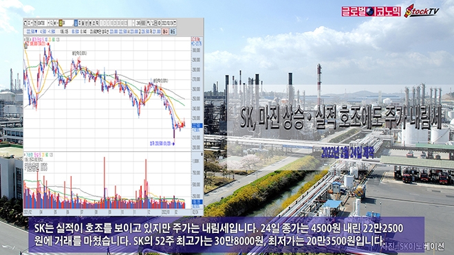 SK는 실적이 호조를 보이고 있지만 주가는 내림세입니다. 24일 종가는 4500원 내린 22만2500원에 거래를 마쳤습니다. SK의 52주 최고가는 30만8000원, 최저가는 20만3500원입니다.
