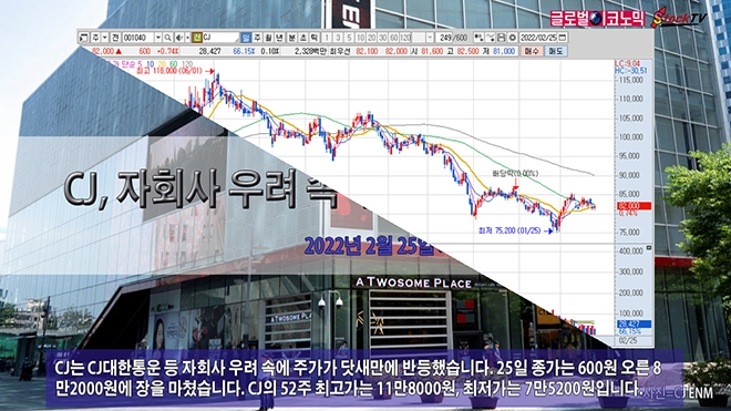 CJ는 CJ대한통운 등 자회사 우려 속에 주가가 닷새만에 반등했습니다. 25일 종가는 600원 오른 8만2000원에 장을 마쳤습니다. CJ의 52주 최고가는 11만8000원, 최저가는 7만5200원입니다.