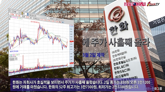한화는 자회사가 호실적을 보이면서 주가가 사흘째 올랐습니다. 2일 종가는 850원 오른 3만1200원에 거래를 마쳤습니다. 한화의 52주 최고가는 3만7300원, 최저가는 2만7700원입니다.