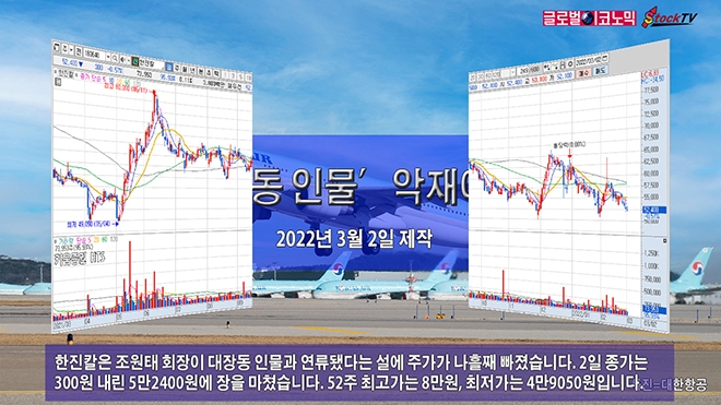 한진칼은 조원태 회장이 ‘대장동 인물’과 연류됐다는 설에 주가가 나흘째 빠졌습니다. 2일 종가는 300원 내린 5만2400원에 장을 마쳤습니다. 52주 최고가는 8만원, 최저가는 4만9050원입니다.