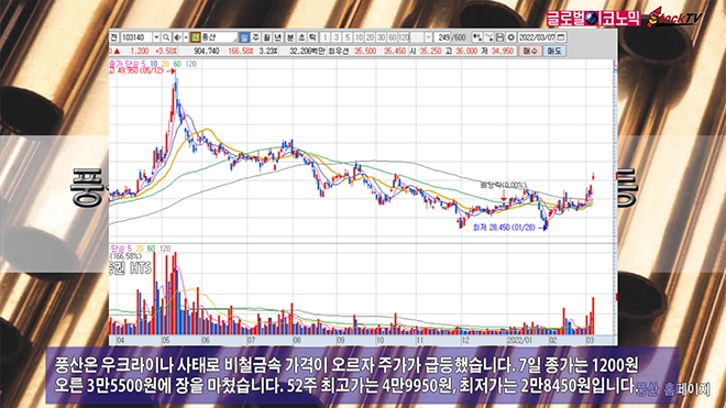 풍산은 우크라이나 사태로 비철금속 가격이 오르자 주가가 급등했습니다. 7일 종가는 1200원 오른 3만5500원에 장을 마쳤습니다. 52주 최고가는 4만9950원, 최저가는 2만8450원입니다.