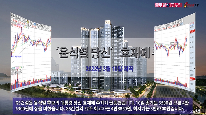 GS건설은 윤석열 후보의 대통령 당선 호재에 주가가 급등했습니다. 10일 종가는 3500원 오른 4만6300원에 장을 마쳤습니다. GS건설의 52주 최고가는 4만8850원, 최저가는 3만6300원입니다.
