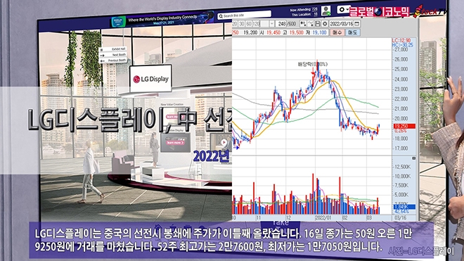 LG디스플레이는 중국의 선전시 봉쇄에 주가가 이틀째 올랐습니다. 16일 종가는 50원 오른 1만9250원에 거래를 마쳤습니다. 52주 최고가는 2만7600원, 최저가는 1만7050원입니다.