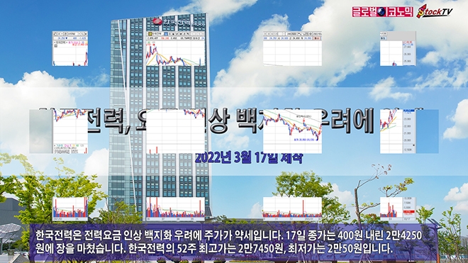 한국전력은 전력요금 인상 백지화 우려에 주가가 약세입니다. 17일 종가는 400원 내린 2만4250원에 장을 마쳤습니다. 한국전력의 52주 최고가는 2만7450원, 최저가는 2만50원입니다.