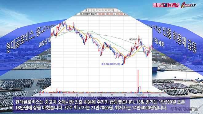 현대글로비스는 중고차 소매시장 진출 허용에 주가가 급등했습니다. 18일 종가는 1만500원 오른 18만원에 장을 마쳤습니다. 52주 최고가는 21만7000원, 최저가는 14만4000원입니다.