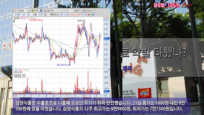 삼양식품은 수출호조로 나흘째 오르던 주가가 하락 반전했습니다. 21일 종가는 1800원 내린 9만500원에 장을 마쳤습니다. 삼양식품의 52주 최고가는 9만9800원, 최저가는 7만7300원입니다.