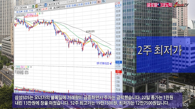 삼성SDS는 오너가의 블록딜에 거래량이 급증하면서 주가는 급락했습니다. 22일 종가는 1만원 내린 13만원에 장을 마쳤습니다. 52주 최고가는 19만7500원, 최저가는 12만7500원입니다.