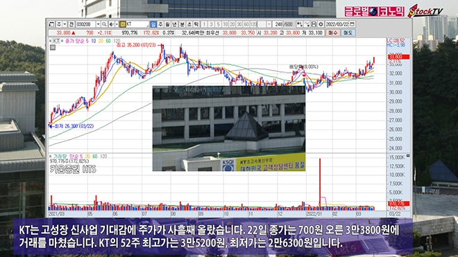 KT는 고성장 신사업 기대감에 주가가 사흘째 올랐습니다. 22일 종가는 700원 오른 3만3800원에 거래를 마쳤습니다. KT의 52주 최고가는 3만5200원, 최저가는 2만6300원입니다.