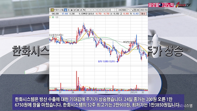 한화시스템은 방산 수출에 대한 기대감에 주가가 상승했습니다. 24일 종가는 200원 오른 1만6750원에 장을 마쳤습니다. 한화시스템의 52주 최고가는 2만900원, 최저가는 1만3850원입니다.