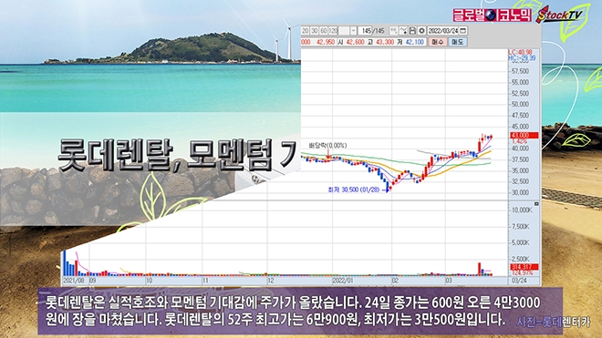 롯데렌탈은 실적호조와 모멘텀 기대감에 주가가 올랐습니다. 24일 종가는 600원 오른 4만3000원에 장을 마쳤습니다. 롯데렌탈의 52주 최고가는 6만900원, 최저가는 3만500원입니다.