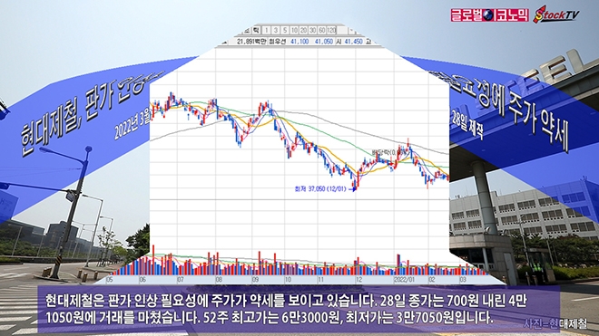 현대제철은 판가 인상 필요성에 주가가 약세를 보이고 있습니다. 28일 종가는 700원 내린 4만1050원에 거래를 마쳤습니다. 52주 최고가는 6만3000원, 최저가는 3만7050원입니다.