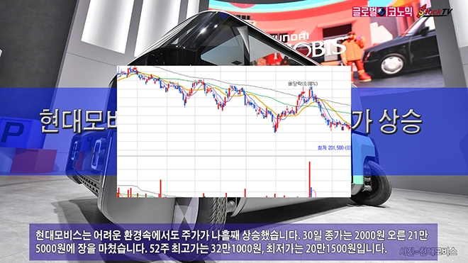 현대모비스는 어려운 환경속에서도 주가가 나흘째 상승했습니다. 30일 종가는 2000원 오른 21만5000원에 장을 마쳤습니다. 52주 최고가는 32만1000원, 최저가는 20만1500원입니다.
