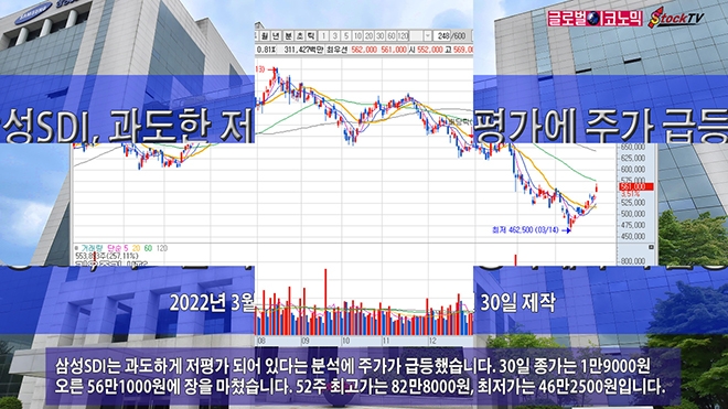 삼성SDI는 과도하게 저평가 되어 있다는 분석에 주가가 급등했습니다. 30일 종가는 1만9000원 오른 56만1000원에 장을 마쳤습니다. 52주 최고가는 82만8000원, 최저가는 46만2500원입니다.