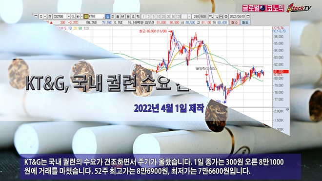 KT&G는 국내 궐련의 수요가 견조하면서 주가가 올랐습니다. 1일 종가는 300원 오른 8만1000원에 거래를 마쳤습니다. 52주 최고가는 8만6900원, 최저가는 7만6600원입니다.