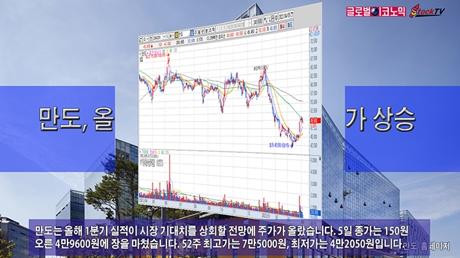 만도는 올해 1분기 실적이 시장 기대치를 상회할 전망에 주가가 올랐습니다. 5일 종가는 150원 오른 4만9600원에 장을 마쳤습니다. 52주 최고가는 7만5000원, 최저가는 4만2050원입니다.