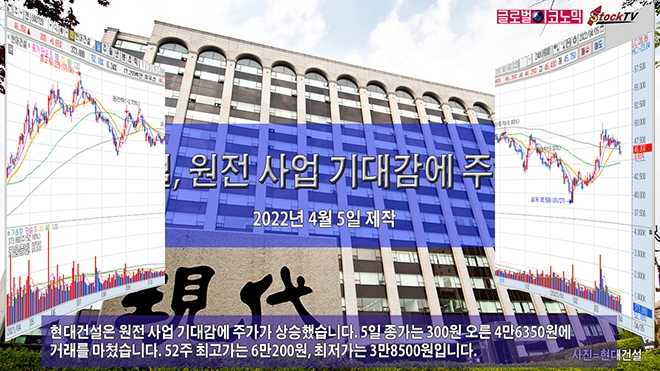 현대건설은 원전 사업 기대감에 주가가 상승했습니다. 5일 종가는 300원 오른 4만6350원에 거래를 마쳤습니다. 52주 최고가는 6만200원, 최저가는 3만8500원입니다.