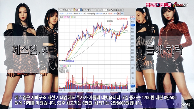 에스엠은 지배구조 개선 기대감에도 주가가 이틀째 내렸습니다. 5일 종가는 1700원 내린 8만500원에 거래를 마쳤습니다. 52주 최고가는 9만원, 최저가는 2만8600원입니다.
