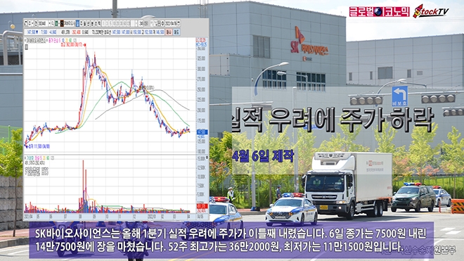 SK바이오사이언스는 올해 1분기 실적 우려에 주가가 이틀째 내렸습니다. 6일 종가는 7500원 내린 14만7500원에 장을 마쳤습니다. 52주 최고가는 36만2000원, 최저가는 11만1500원입니다.
