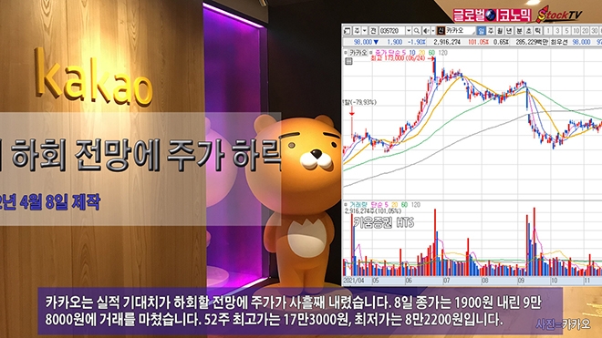 카카오는 실적 기대치가 하회할 전망에 주가가 사흘째 내렸습니다. 8일 종가는 1900원 내린 9만8000원에 거래를 마쳤습니다. 52주 최고가는 17만3000원, 최저가는 8만2200원입니다.