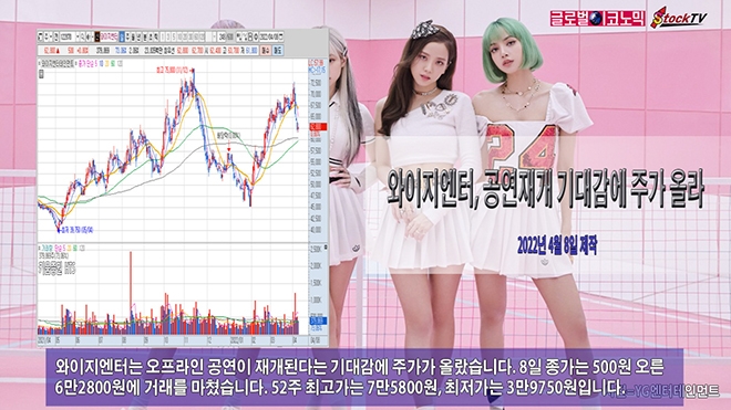 와이지엔터는 오프라인 공연이 재개된다는 기대감에 주가가 올랐습니다. 8일 종가는 500원 오른 6만2800원에 거래를 마쳤습니다. 52주 최고가는 7만5800원, 최저가는 3만9750원입니다.