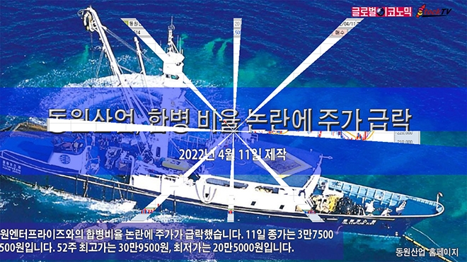 동원산업은 동원엔터프라이즈와의 합병비율 논란에 주가가 급락했습니다. 11일 종가는 3만7500원 내린 22만7500원입니다. 52주 최고가는 30만9500원, 최저가는 20만5000원입니다.