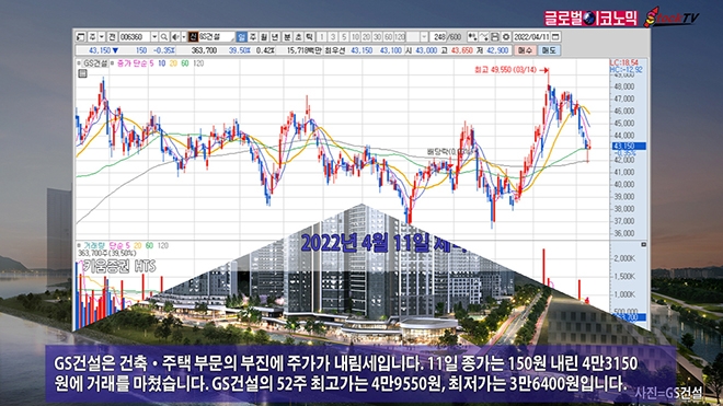 GS건설은 건축·주택 부문의 부진에 주가가 내림세입니다. 11일 종가는 150원 내린 4만3150원에 거래를 마쳤습니다. GS건설의 52주 최고가는 4만9550원, 최저가는 3만6400원입니다.