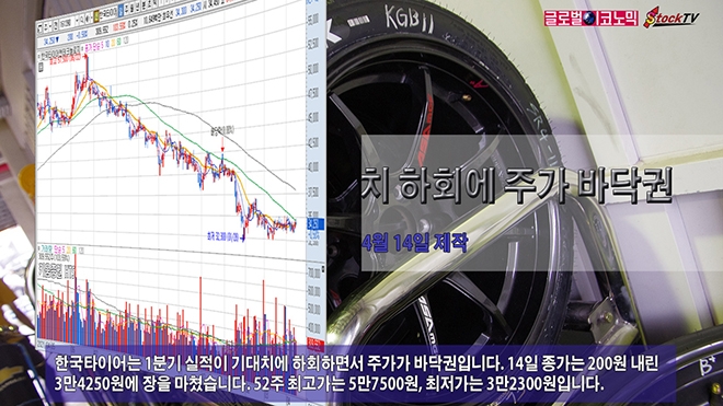 한국타이어는 1분기 실적이 기대치에 하회하면서 주가가 바닥권입니다. 14일 종가는 200원 내린 3만4250원에 장을 마쳤습니다. 52주 최고가는 5만7500원, 최저가는 3만2300원입니다.