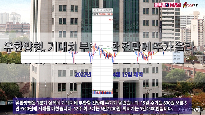 유한양행은 1분기 실적이 기대치에 부합할 전망에 주가가 올랐습니다. 15일 주가는 600원 오른 5만9500원에 거래를 마쳤습니다. 52주 최고가는 6만7200원, 최저가는 5만4500원입니다.
