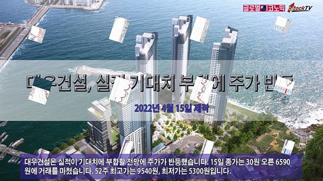 대우건설은 실적이 기대치에 부합할 전망에 주가가 반등했습니다. 15일 종가는 30원 오른 6590원에 거래를 마쳤습니다. 52주 최고가는 9540원, 최저가는 5300원입니다.