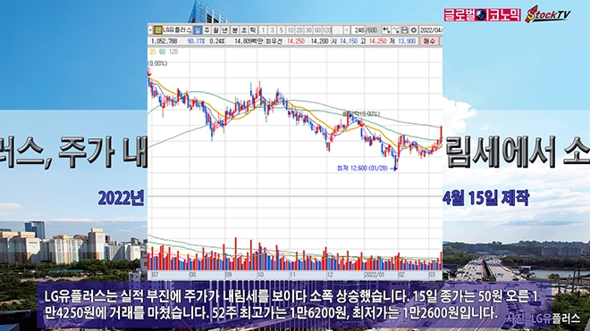 LG유플러스는 실적 부진에 주가가 내림세를 보이다 소폭 상승했습니다. 15일 종가는 50원 오른 1만4250원에 거래를 마쳤습니다. 52주 최고가는 1만6200원, 최저가는 1만2600원입니다.