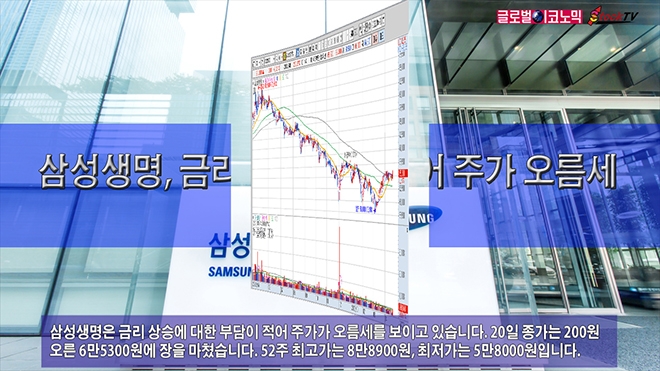 삼성생명은 금리 상승에 대한 부담이 적어 주가가 오름세를 보이고 있습니다. 20일 종가는 200원 오른 6만5300원에 장을 마쳤습니다. 52주 최고가는 8만8900원, 최저가는 5만8000원입니다.