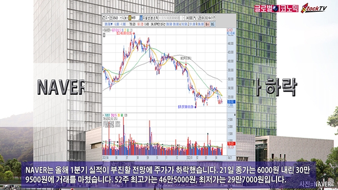 NAVER는 올해 1분기 실적이 부진할 전망에 주가가 하락했습니다. 21일 종가는 6000원 내린 30만9500원에 거래를 마쳤습니다. 52주 최고가는 46만5000원, 최저가는 29만7000원입니다.