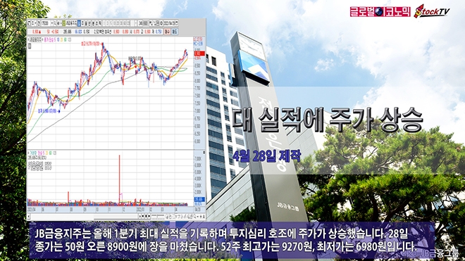 JB금융지주는 올해 1분기 최대 실적을 기록하며 투지심리 호조에 주가가 상승했습니다. 28일 종가는 50원 오른 8900원에 장을 마쳤습니다. 52주 최고가는 9270원, 최저가는 6980원입니다.