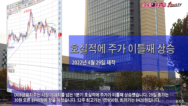 DGB금융지주는 시장 기대치를 넘는 1분기 호실적에 주가가 이틀째 상승했습니다. 29일 종가는 30원 오른 8940원에 장을 마쳤습니다. 52주 최고가는 1만850원, 최저가는 8420원입니다.